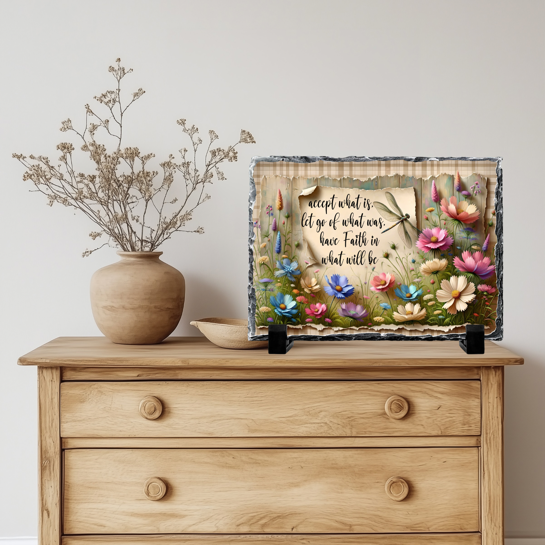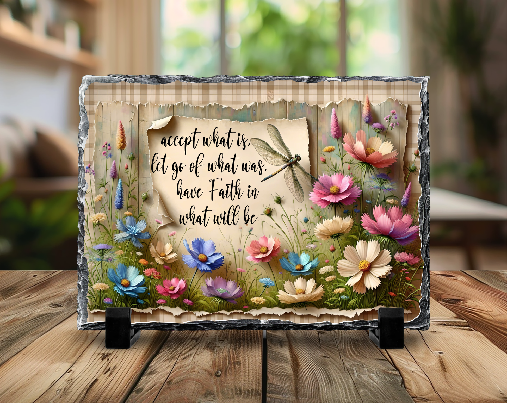 Transform your space with this enchanting slate rock sign featuring an uplifting message surrounded by a garden of vibrant wildflowers and a delicate dragonfly. Measuring 5.5" x 7.5", this natural slate piece displays the inspiring words 'accept what is, let go of what was, have Faith in what will be' in elegant script. The artwork showcases a beautiful array of cosmos flowers in pink, blue, and white hues, creating a dreamy meadow scene. The weathered, torn-paper effect adds vintage charm, while the dragonfly brings a touch of whimsy. Each piece comes complete with display stands, making it perfect for mantels, shelves, or desk displays. The durable natural slate construction ensures lasting beauty, while the artistic design makes it an ideal gift for those seeking daily inspiration. This decorative sign seamlessly blends rustic charm with contemporary style, making it a meaningful addition to any room's decor.