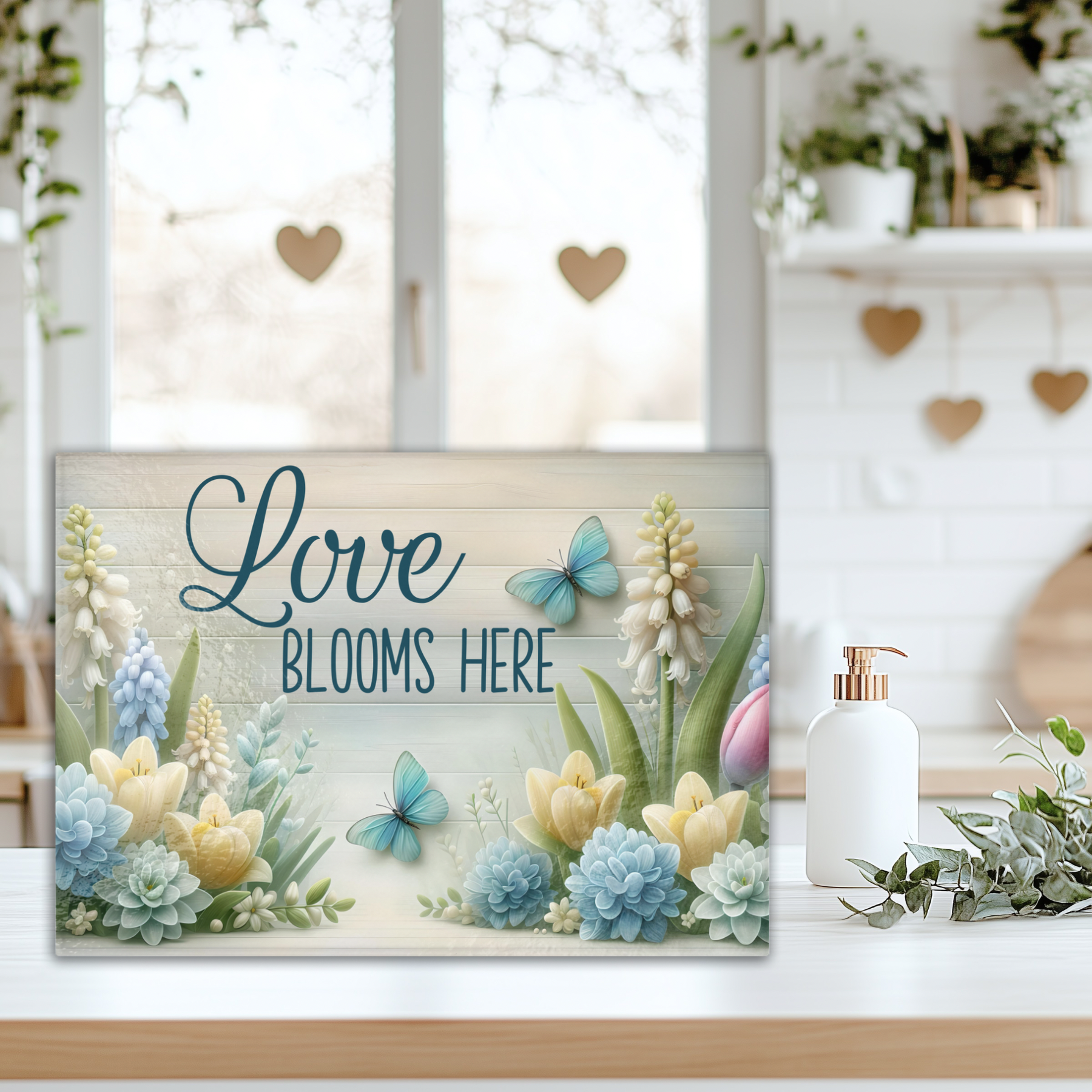 Bring a touch of springtime charm and heartfelt sentiment to your kitchen with this "Love Blooms Here" tempered glass cutting board. Adorned with delicate blue butterflies fluttering amongst a vibrant array of blooming flowers in soft blues, yellows, and whites, this design evokes a sense of warmth and renewal. The elegant script boldly declares "Love Blooms Here," making it a beautiful focal point for your kitchen decor.
